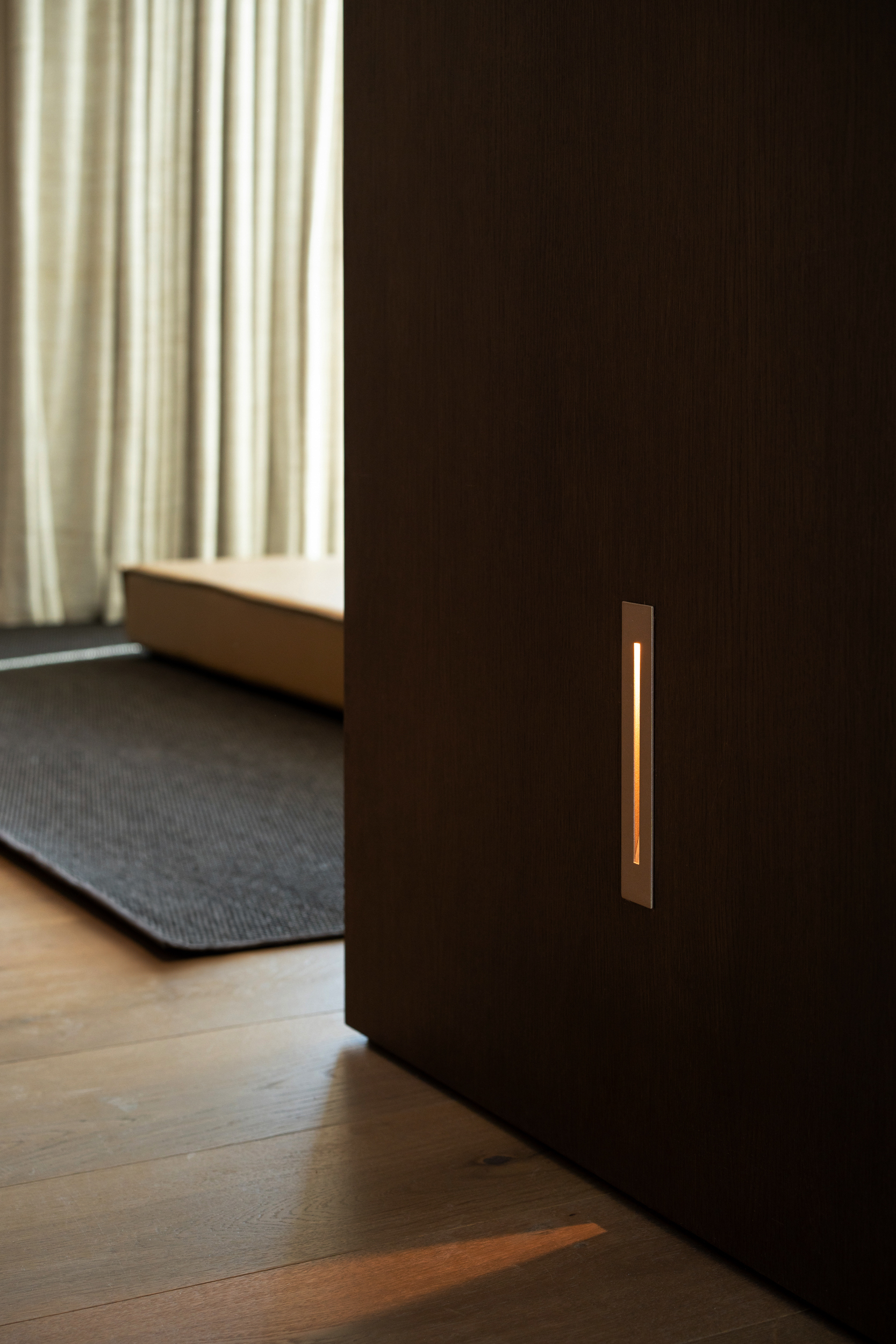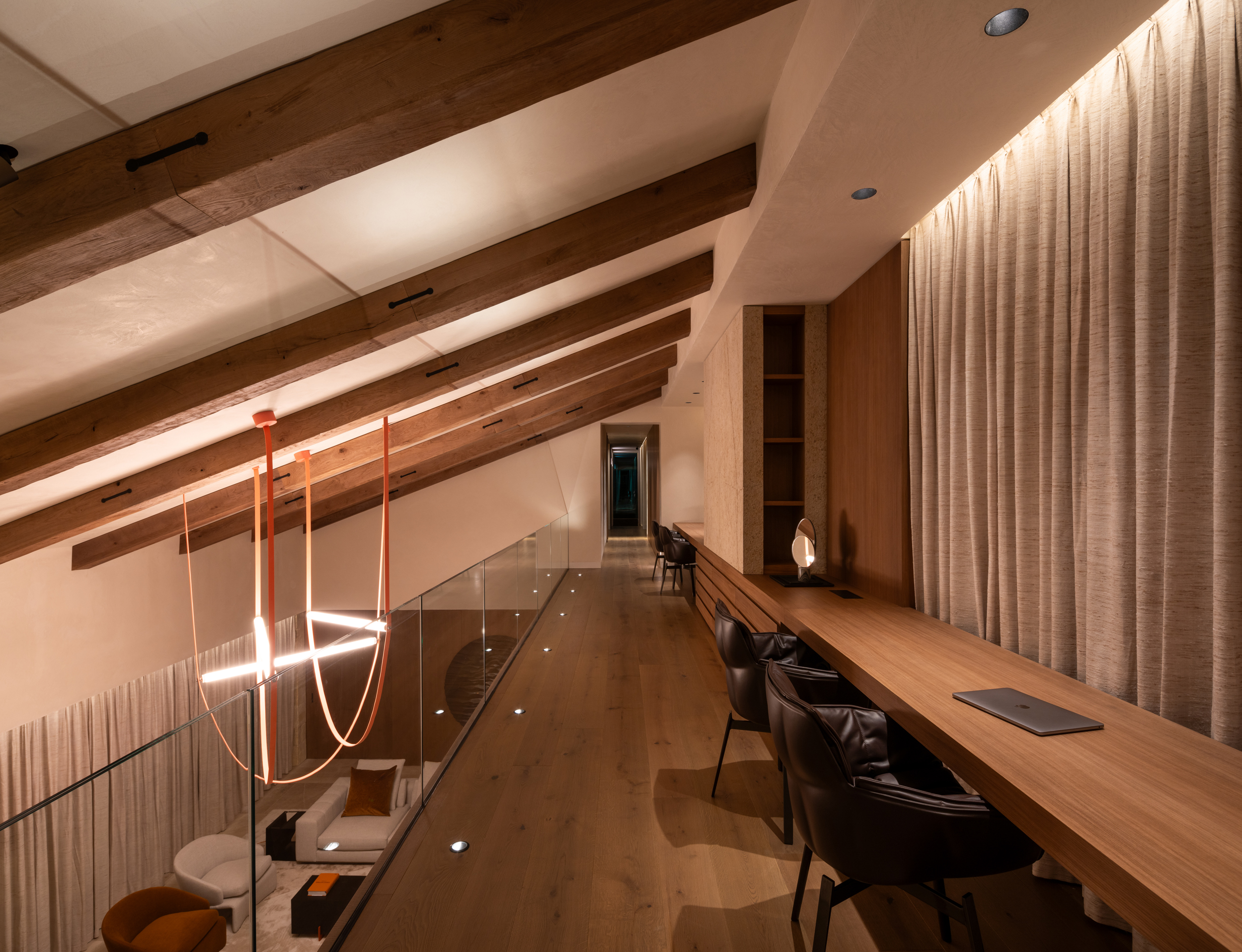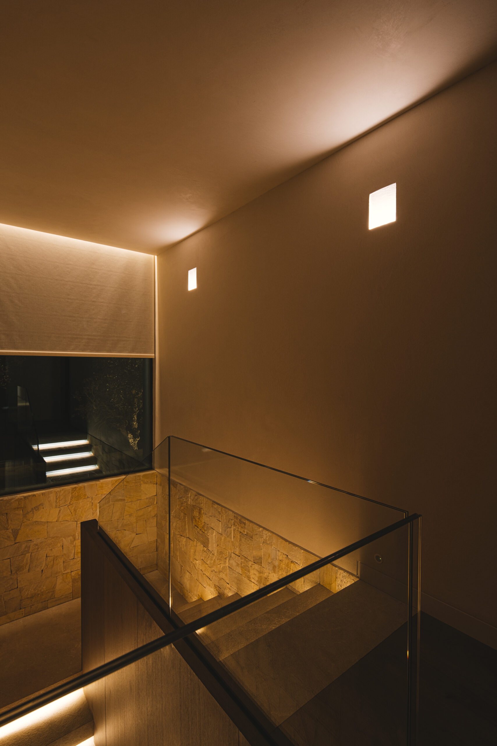 Uno de los aspectos más destacados es la cuidadosa selección de luminarias de la conocida marca belga Delta Light, pensadas para satisfacer las exigencias más elevadas.  No solo se ha priorizado el confort visual, sino también la integración de cada elemento con el diseño de interiorismo. Se ha prestado especial atención a la elección de color de las luminarias, utilizando tonos específicos de RAL (código que define un color mediante un conjunto de dígitos) con el fin de asegurar una coherencia estética en todo el espacio. Este enfoque minucioso no solo garantiza que la luz realce cada detalle, sino que también permite jugar con la combinación de luces y sombras para destacar las distintas texturas y materiales empleados. Los paramentos de piedra y madera, característicos de este proyecto, adquieren un carácter especial al ser realzados por los efectos de iluminación y la calidez de la luz, creando una atmósfera que envuelve y cautiva.