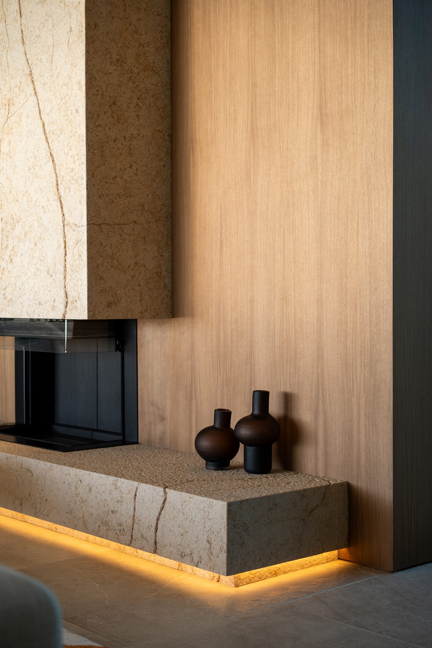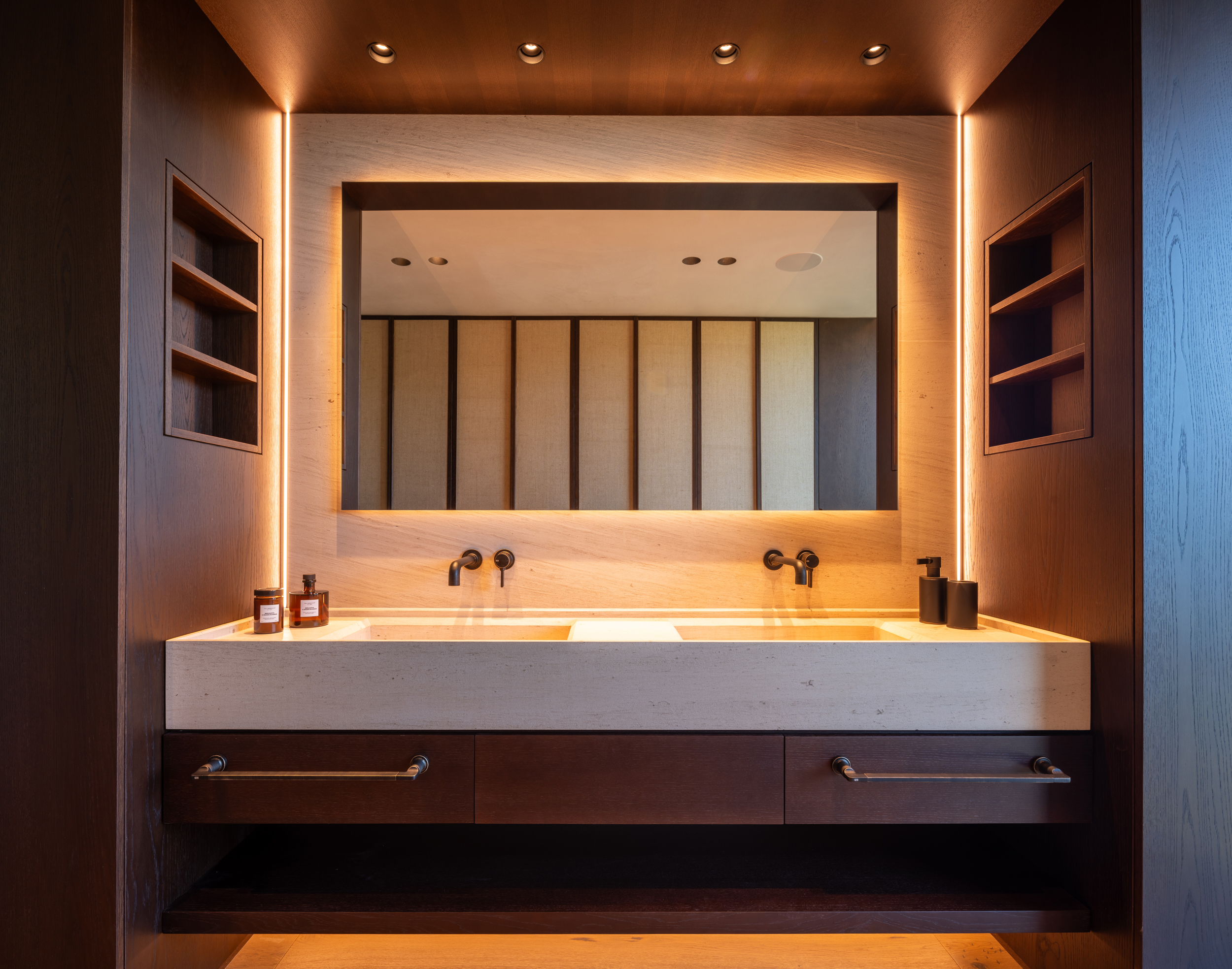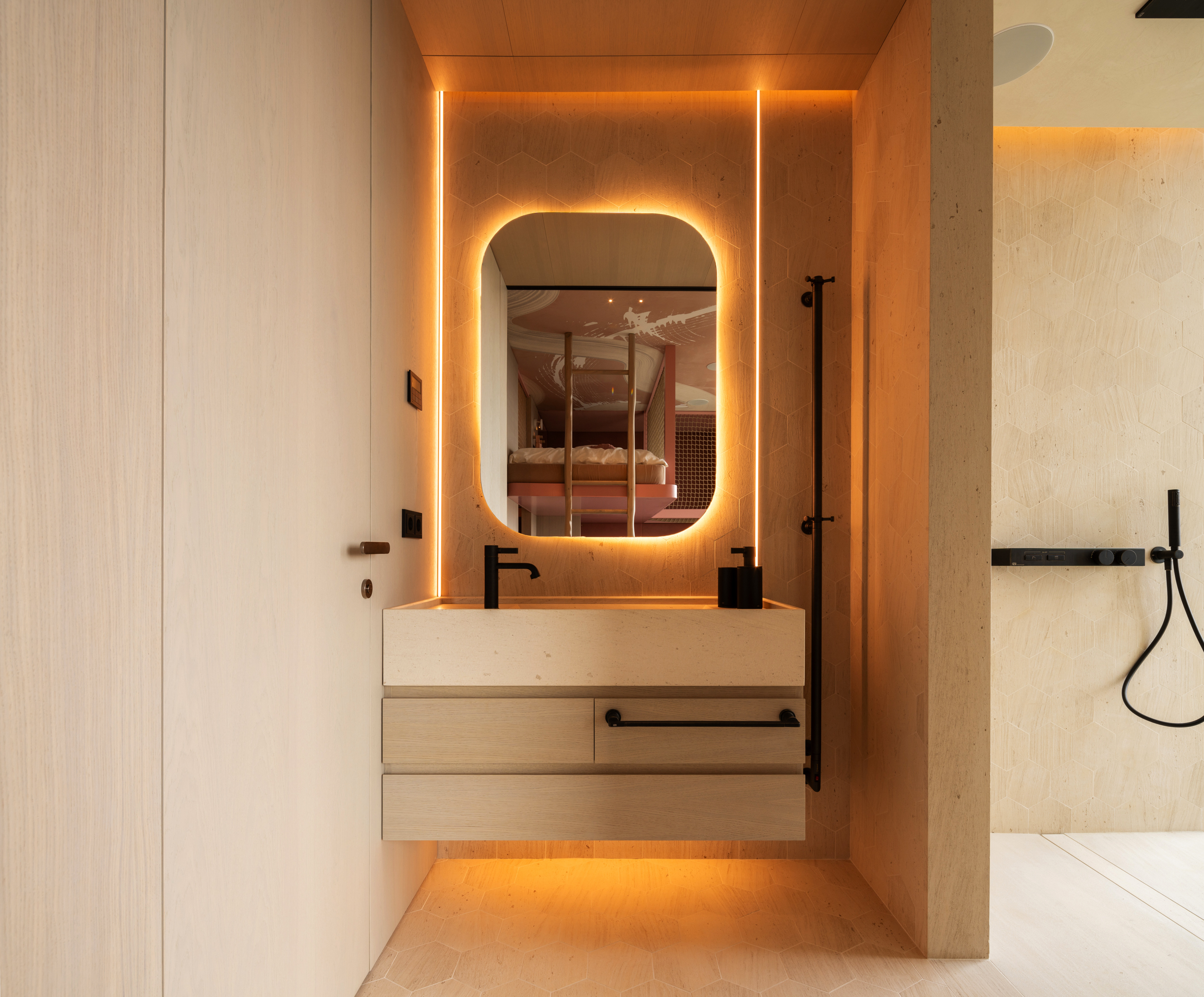 Uno de los aspectos más destacados es la cuidadosa selección de luminarias de la conocida marca belga Delta Light, pensadas para satisfacer las exigencias más elevadas.  No solo se ha priorizado el confort visual, sino también la integración de cada elemento con el diseño de interiorismo. Se ha prestado especial atención a la elección de color de las luminarias, utilizando tonos específicos de RAL (código que define un color mediante un conjunto de dígitos) con el fin de asegurar una coherencia estética en todo el espacio. Este enfoque minucioso no solo garantiza que la luz realce cada detalle, sino que también permite jugar con la combinación de luces y sombras para destacar las distintas texturas y materiales empleados. Los paramentos de piedra y madera, característicos de este proyecto, adquieren un carácter especial al ser realzados por los efectos de iluminación y la calidez de la luz, creando una atmósfera que envuelve y cautiva.