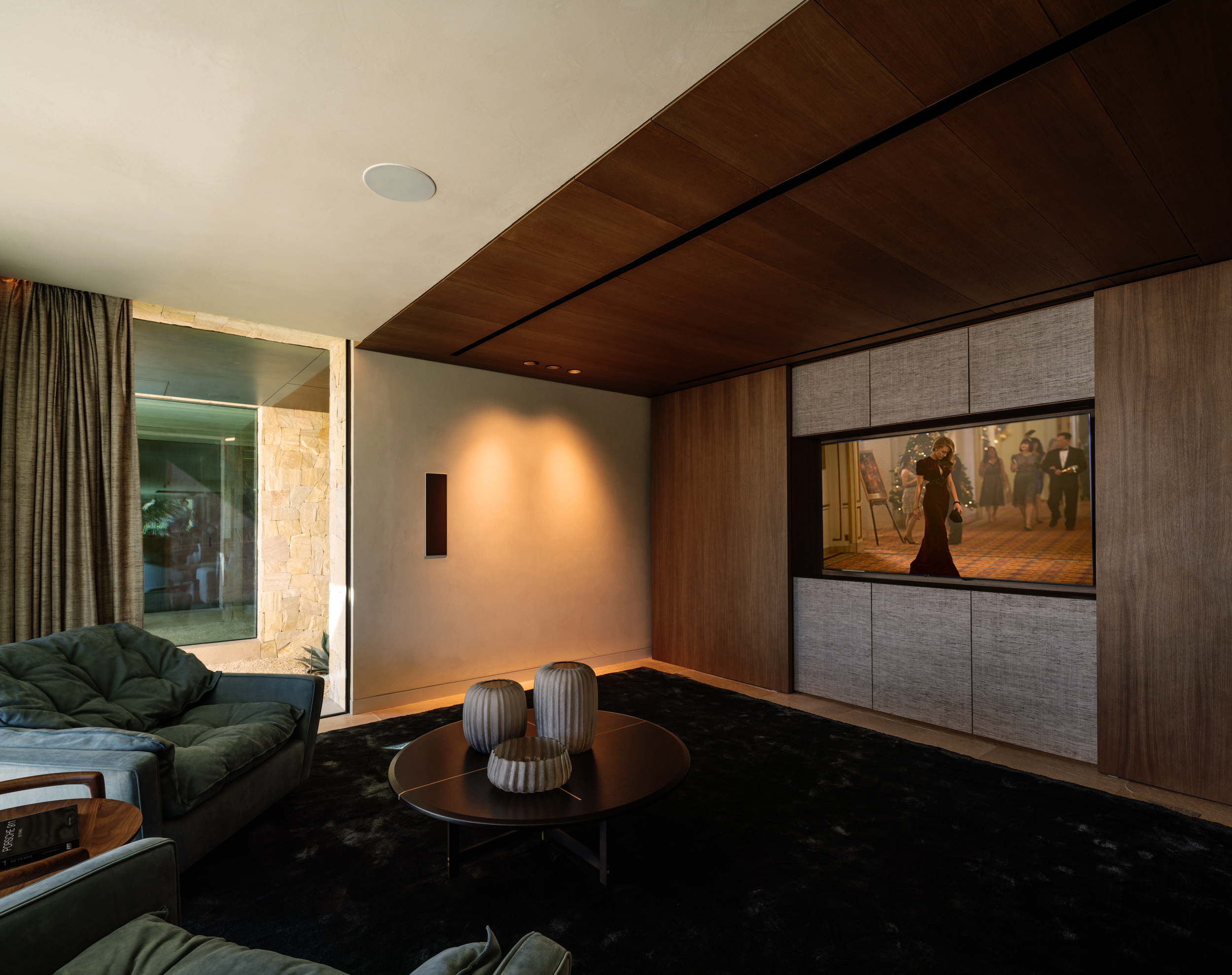Para garantizar una experiencia acústica excepcional en los espacios exteriores, se han instalado altavoces del modelo Medium Cylinder de Architettura Sonora. Estos altavoces no solo destacan por su calidad sonora, sino también por su diseño elegante en cemento gris y aluminio negro que se integra perfectamente con el entorno natural de la villa. La música fluye de manera armoniosa a lo largo de los jardines y terrazas, ofreciendo un sonido continuo y envolvente que acompaña cada momento al aire libre, sin comprometer la estética exterior.